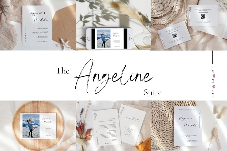 The Angeline Suite showcases a beautiful brushstroke font paired with a simple serif font. Featured on the edge is a short matching string of text to spotlight a key detail of your event such as a date or your names.