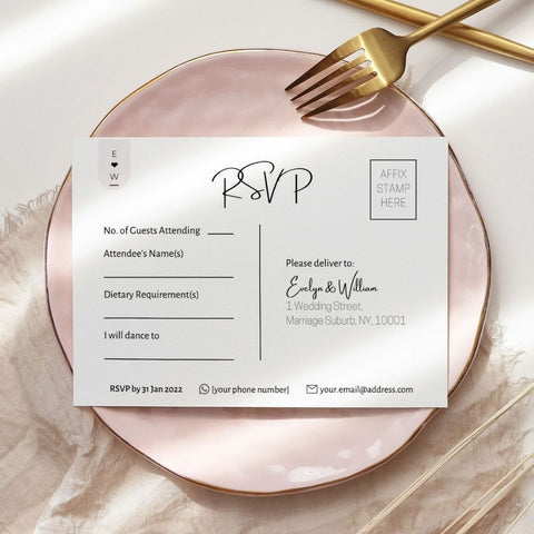 Customise the colour scheme as you wish with this elegant RSVP Card to suit your unique wedding or event theme colour palette. It also features our designer's carefully selected Canva font pairing and our simple yet classic RSVP Card wording example.