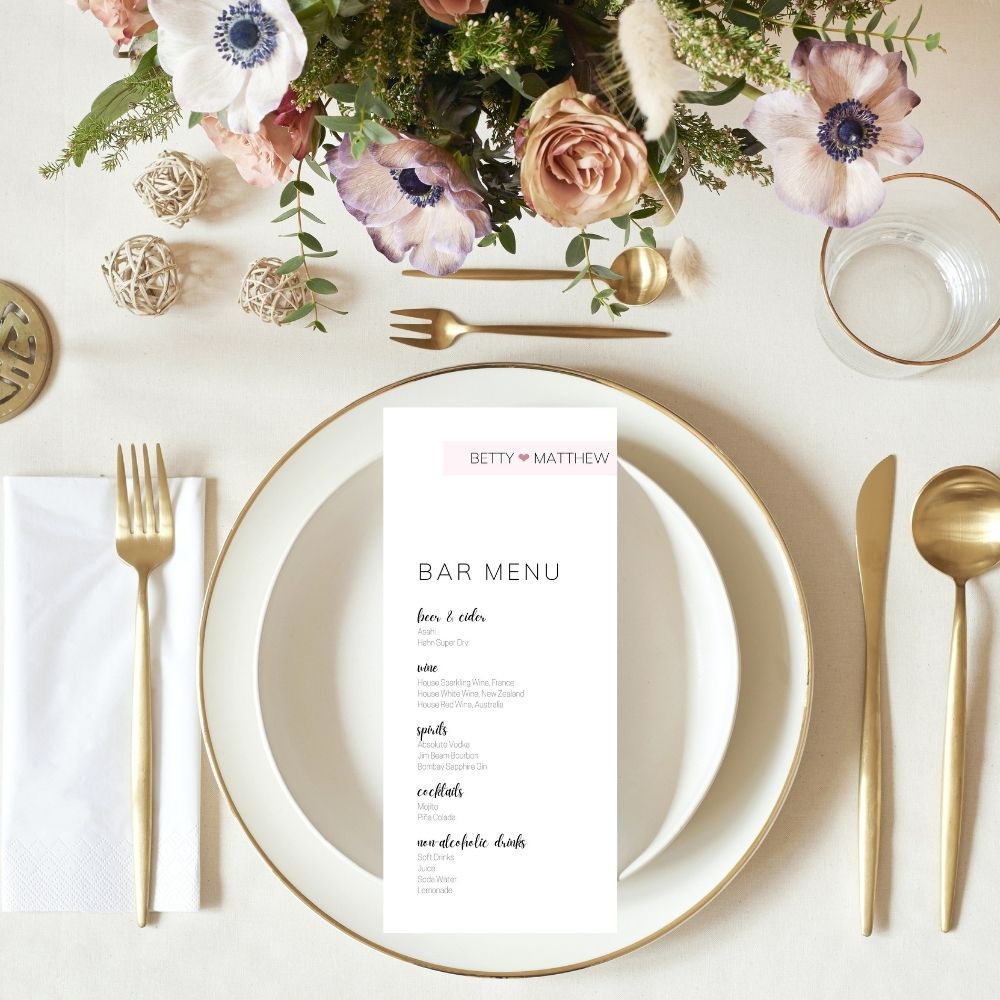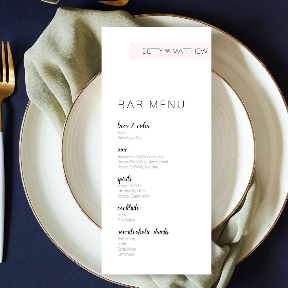 This is a DIY printable Drinks Menu Canva digital template for a modern minimalist theme wedding, party or event.