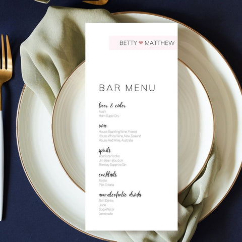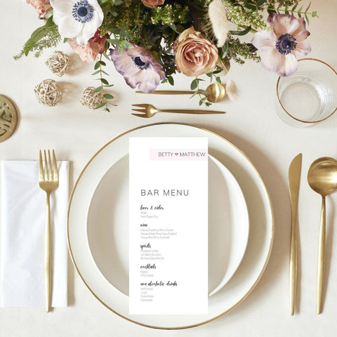 Customise the colour scheme as you wish with this elegant Drinks Menu to suit your unique wedding, party or event theme colour palette. It also features our designer's carefully selected Canva font pairing.
