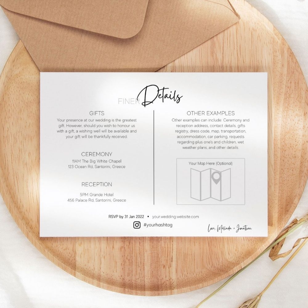 Customise the colour scheme as you wish with this elegant Wedding Invitation 3-piece Suite to suit your unique Wedding theme colour palette. It also features our designer's carefully selected Canva font pairing and our simple yet classic Wedding wording example.