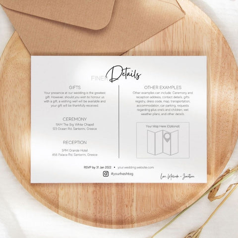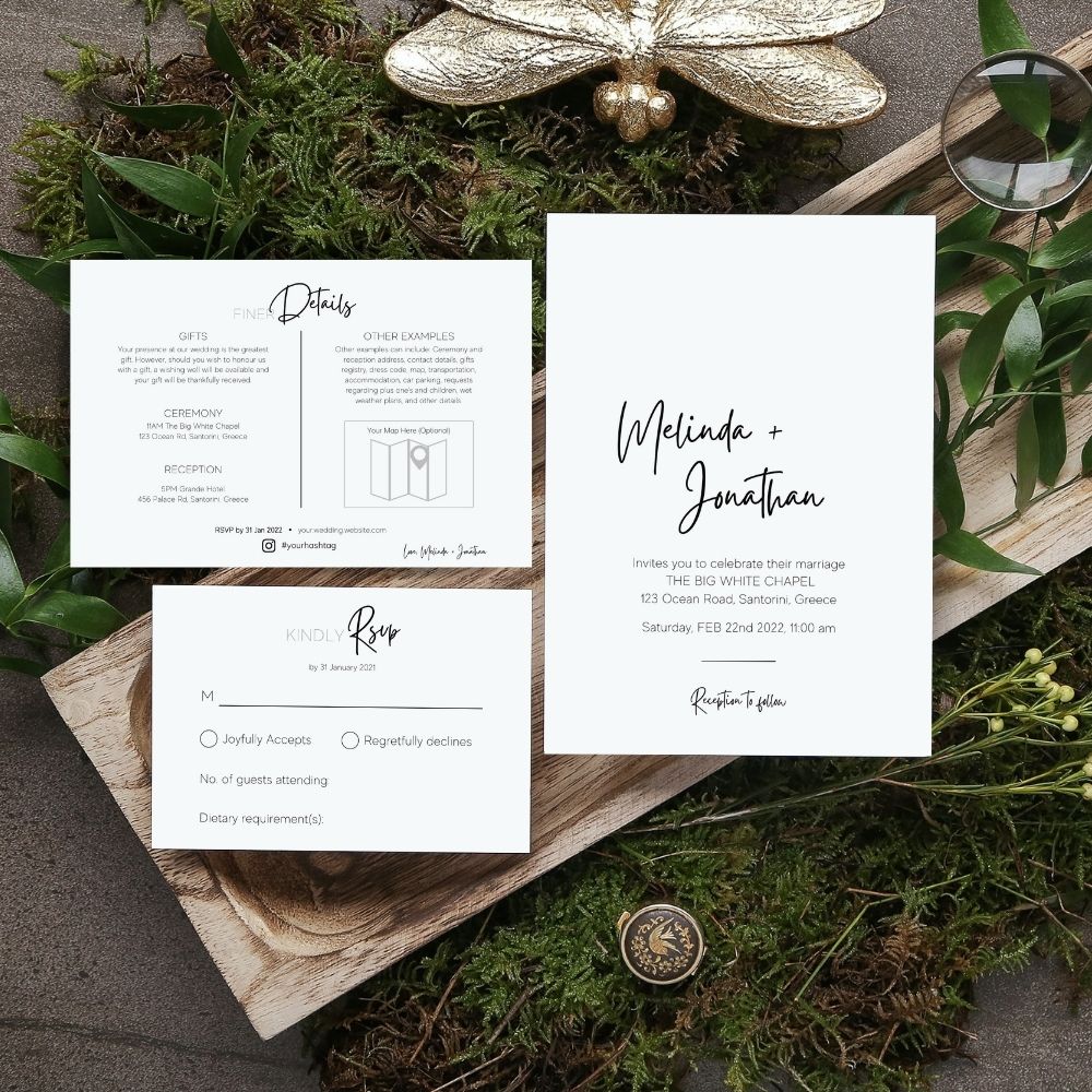 This is a DIY printable Wedding Invitation 3-piece Suite Canva digital template for a modern minimalist theme Wedding.