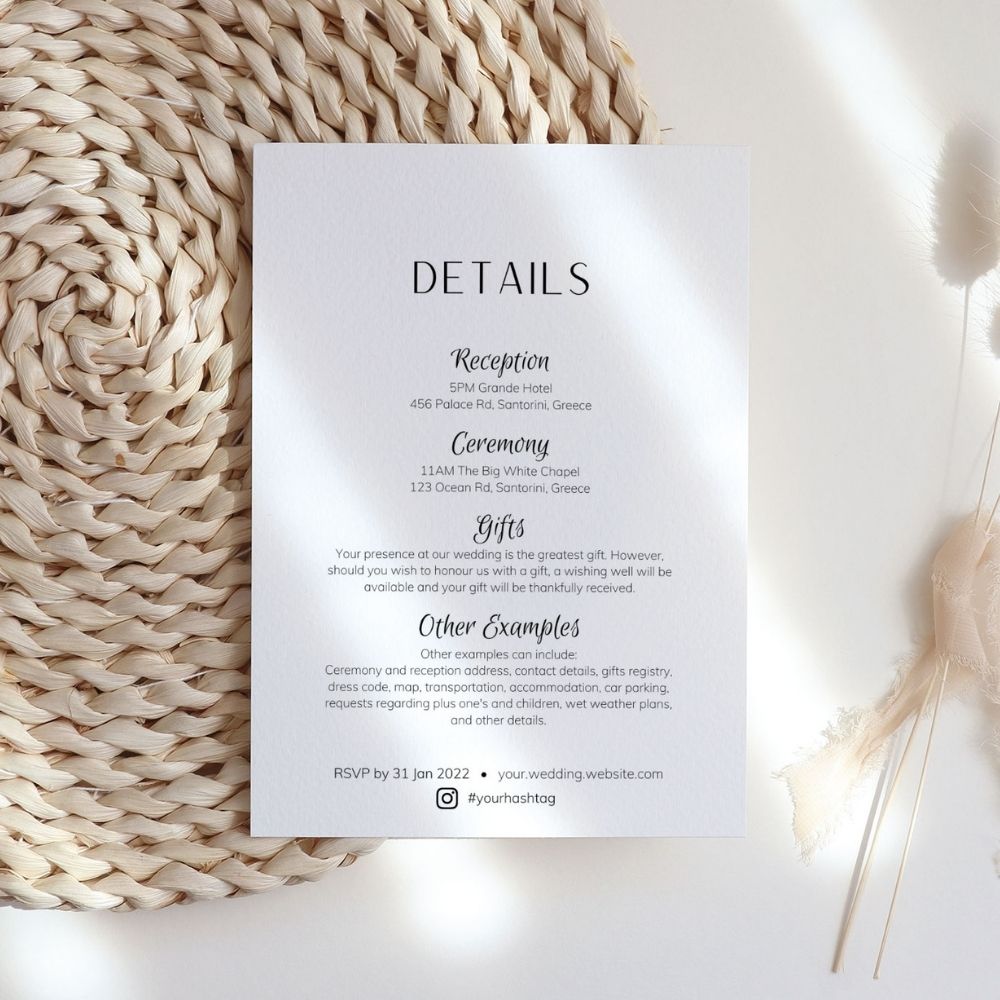 This is a DIY printable Details Card Canva digital template for a modern minimalist theme wedding or event.
